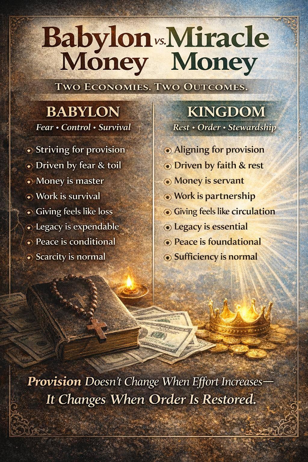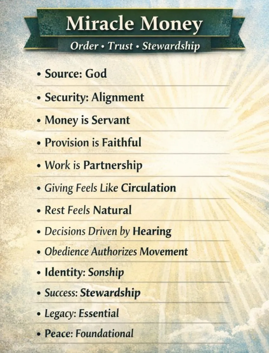 Miracle Money restores God’s order in provision. Inside, you’ll learn the M.I.R.A.C.L.E. framework - the seven conditions under which provision becomes peaceful, trustworthy, and generative again.